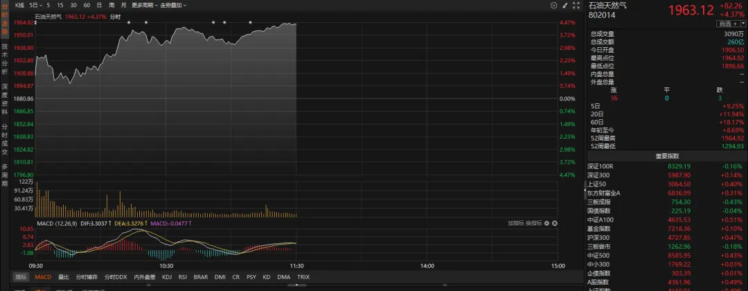 此外,伴随油价走高,石油天然气板块走强,中国海油股价再创新高。在涨价潮催化下,半导体板块继续活跃,中微半导早盘触及“20cm”涨停。