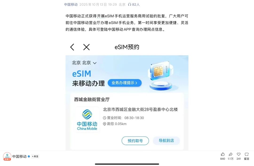 · 中国移动:证实已获商用试验批复,用户可前往线下营业厅办理手机eSIM业务,或登录中国移动App查询就近办理网点,第一时间体验无实体卡的便捷通信服务。