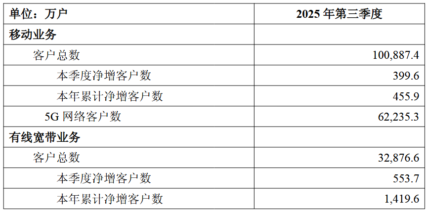 10月20日,中国移动(600941/00941/80941)发布公告,2025年第三季度,公司移动业务客户总数达10亿户,本季度净增客户400万户;有线宽带业务客户总数达3.29亿户,本季度净增客户数554万户,具体如下: