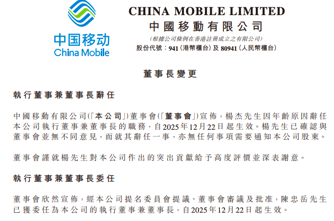 12月22日晚间,中国移动在港交所发布公告,董事会宣布杨杰因年龄原因辞任公司执行董事兼董事长的职务,自2025年12月22日起生效。同时,董事会宣布,经公司提名委员会提议、董事会审议及批准,陈忠岳已获委任为公司执行董事兼董事长,自2025年12月22日起生效。