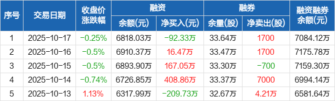 新天绿能:融资净偿还92.33万元,融资余额6818.03万元(10-17)