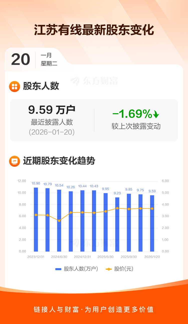 江苏有线:截至1月20日最新股东户数9.59万户,较上期减少1.69%