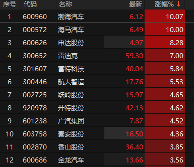 汽车板块拉升 渤海汽车、海马汽车涨停
