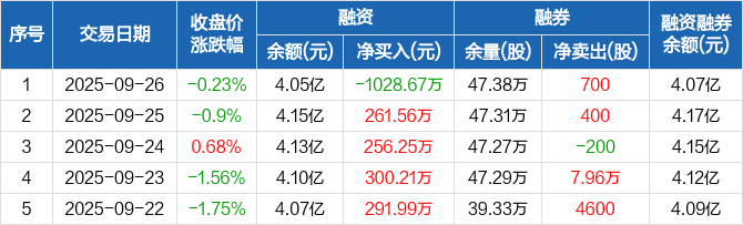 岳阳林纸:融资净偿还1028.67万元,融资余额4.05亿元(09-26)