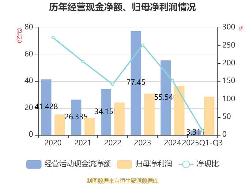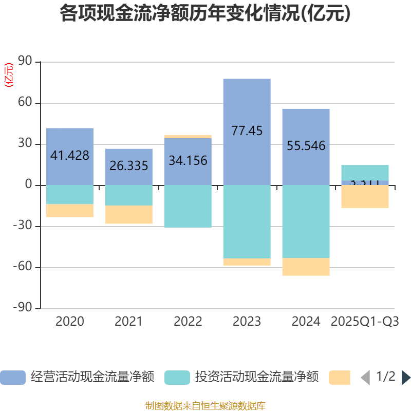 2025年前三季度,公司经营活动现金流净额为3.31亿元,同比下降80.03%;筹资活动现金流净额-16.86亿元,同比减少3.78亿元;投资活动现金流净额11.27亿元,上年同期为-30.43亿元。