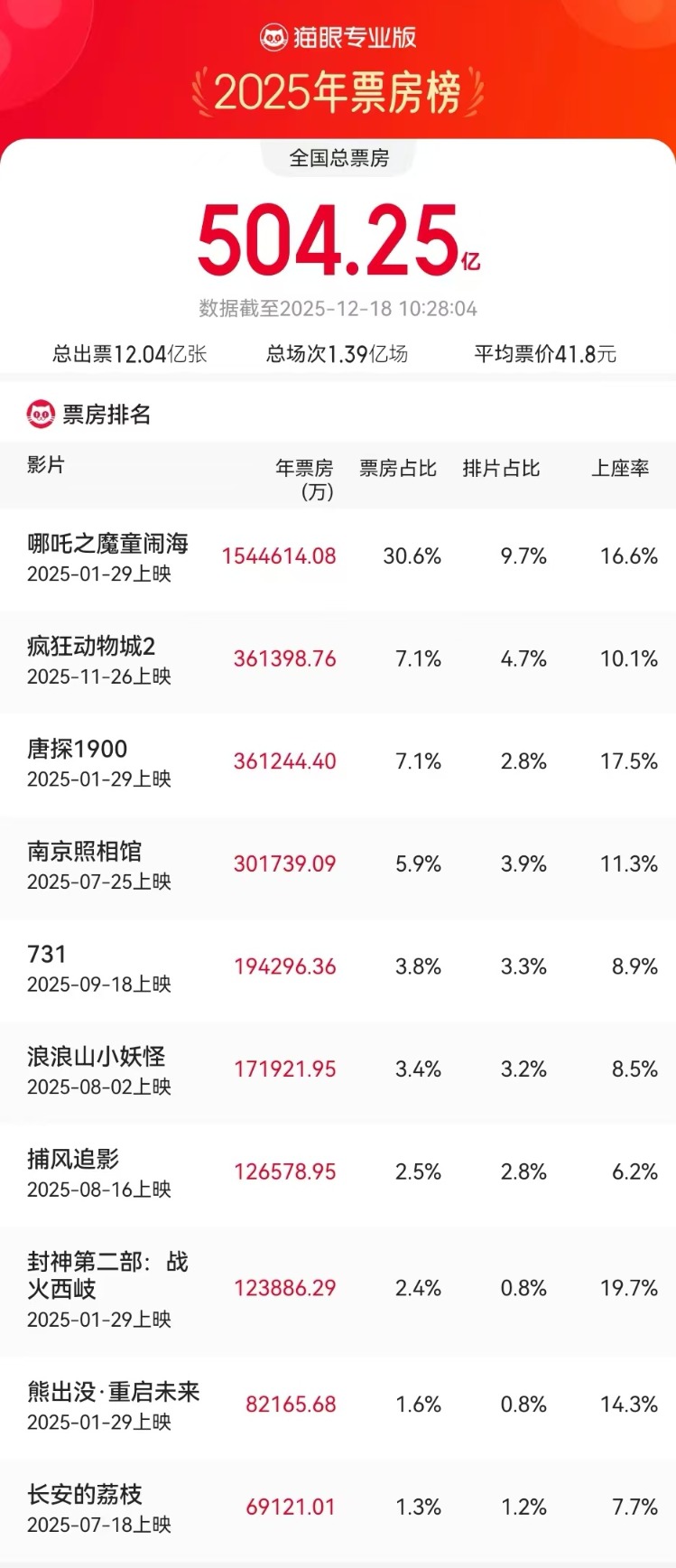 从全年票房来看,根据国家电影局统计,截至2025年12月13日14时30分,全年总票房已达500.03亿元,总人次为11.94亿,其中国产影片票房为409.52亿元,国产影片份额为81.90%。