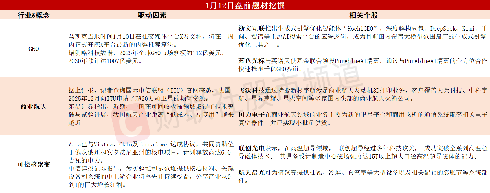 ①马斯克将开源X平台内容推荐算法,GEO概念有望站上市场风口。②我国新增20万颗卫星申请,机构坚定看好商业航天发展机遇。③Meta投资核电厂为AI提供电力,核聚变产业链有望迎订单放量。