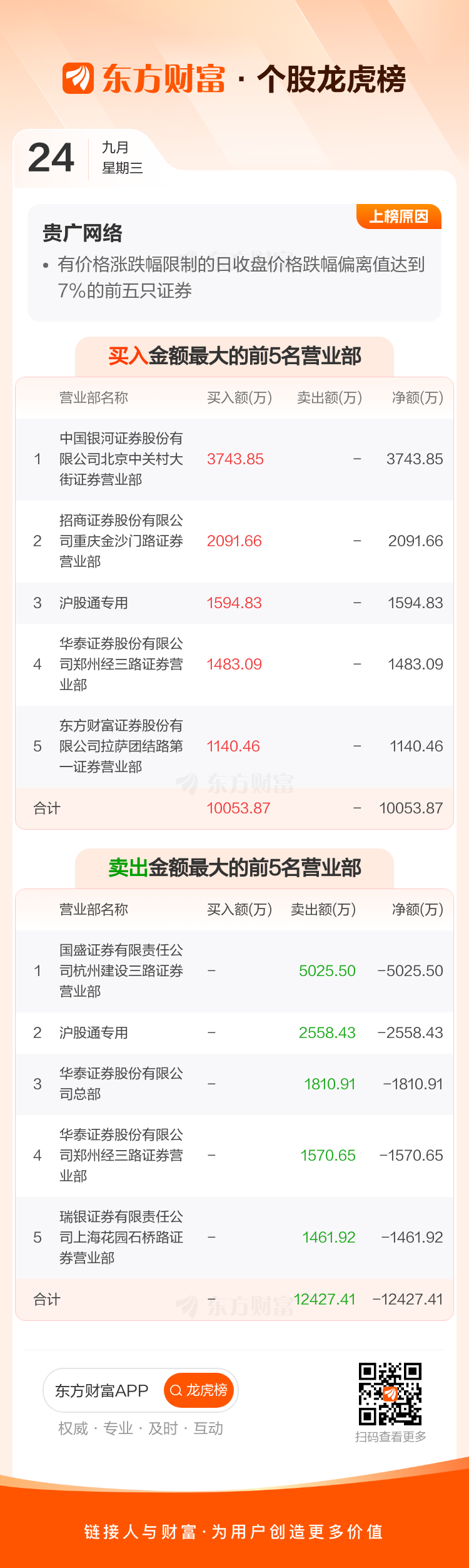 交易所2025年9月24日公布的交易公开信息显示,贵广网络因成为有价格涨跌幅限制的日收盘价格跌幅偏离值达到7%的前五只证券上榜。贵广网络当日收报9.79元,涨跌幅-10.02%,偏离值-10.85%,换手率8.97%,成交额11.24亿。