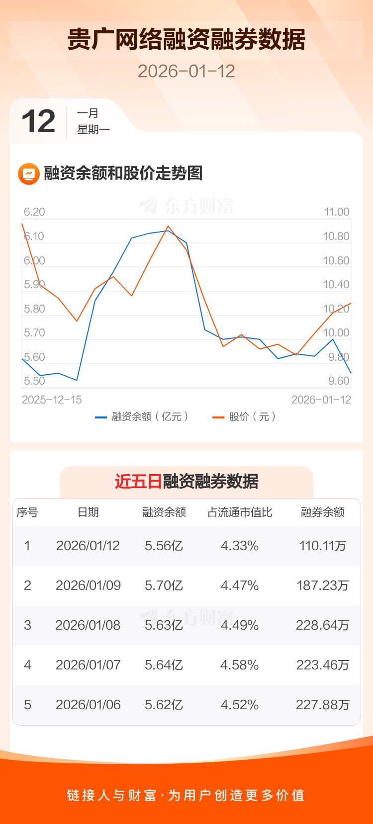 交易所最新数据显示,贵广网络于2026年1月12日获融资买入3145.77万元,融资偿还4517.88万元,当日融资净偿还1372.12万元。目前,该股融资余额5.56亿,占流通市值比例为4.33%。