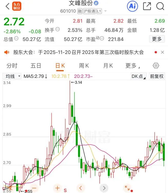 截至11月20日收盘,文峰股份下跌2.86%,报2.72元/股,总市值为50.27亿元。