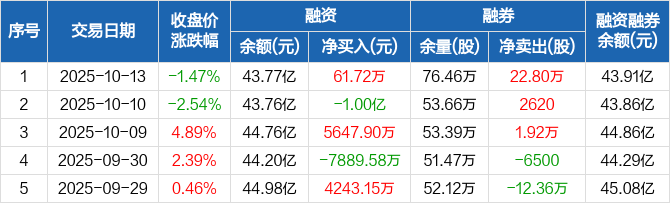 融资方面,当日融资买入2.21亿元,融资偿还2.21亿元,融资净买入61.72万元。融券方面,融券卖出32.33万股,融券偿还9.53万股,融券余量76.46万股,融券余额1386.14万元。融资融券余额合计43.91亿元。