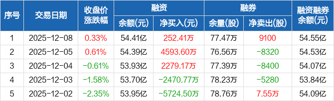 融资方面,当日融资买入2.26亿元,融资偿还2.24亿元,融资净买入252.41万元,连续3日净买入累计7125.18万元。融券方面,融券卖出7.06万股,融券偿还6.15万股,融券余量77.47万股,融券余额1400.69万元。融资融券余额合计54.55亿元。