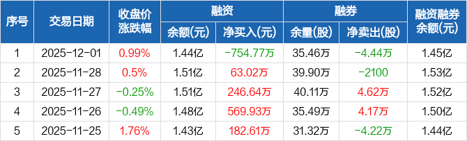 融资方面,当日融资买入630.7万元,融资偿还1385.46万元,融资净偿还754.77万元。融券方面,融券卖出0股,融券偿还4.44万股,融券余量35.46万股,融券余额144.68万元。融资融券余额合计1.45亿元。