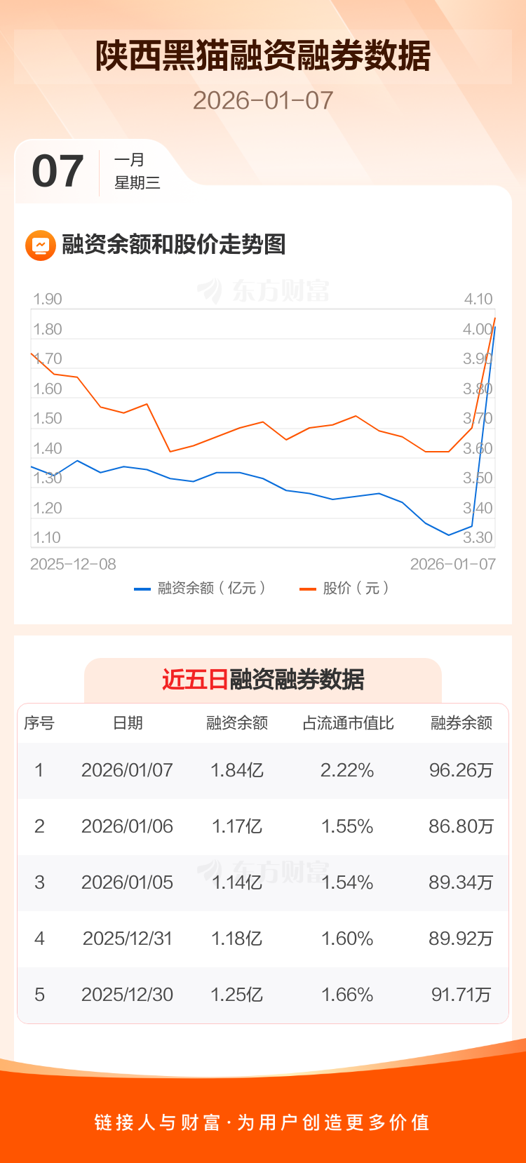 交易所最新数据显示,陕西黑猫于2026年1月7日获融资买入8402.96万元,融资偿还1680.80万元,当日融资净买入6722.16万元。目前,该股融资余额1.84亿,占流通市值比例为2.22%。