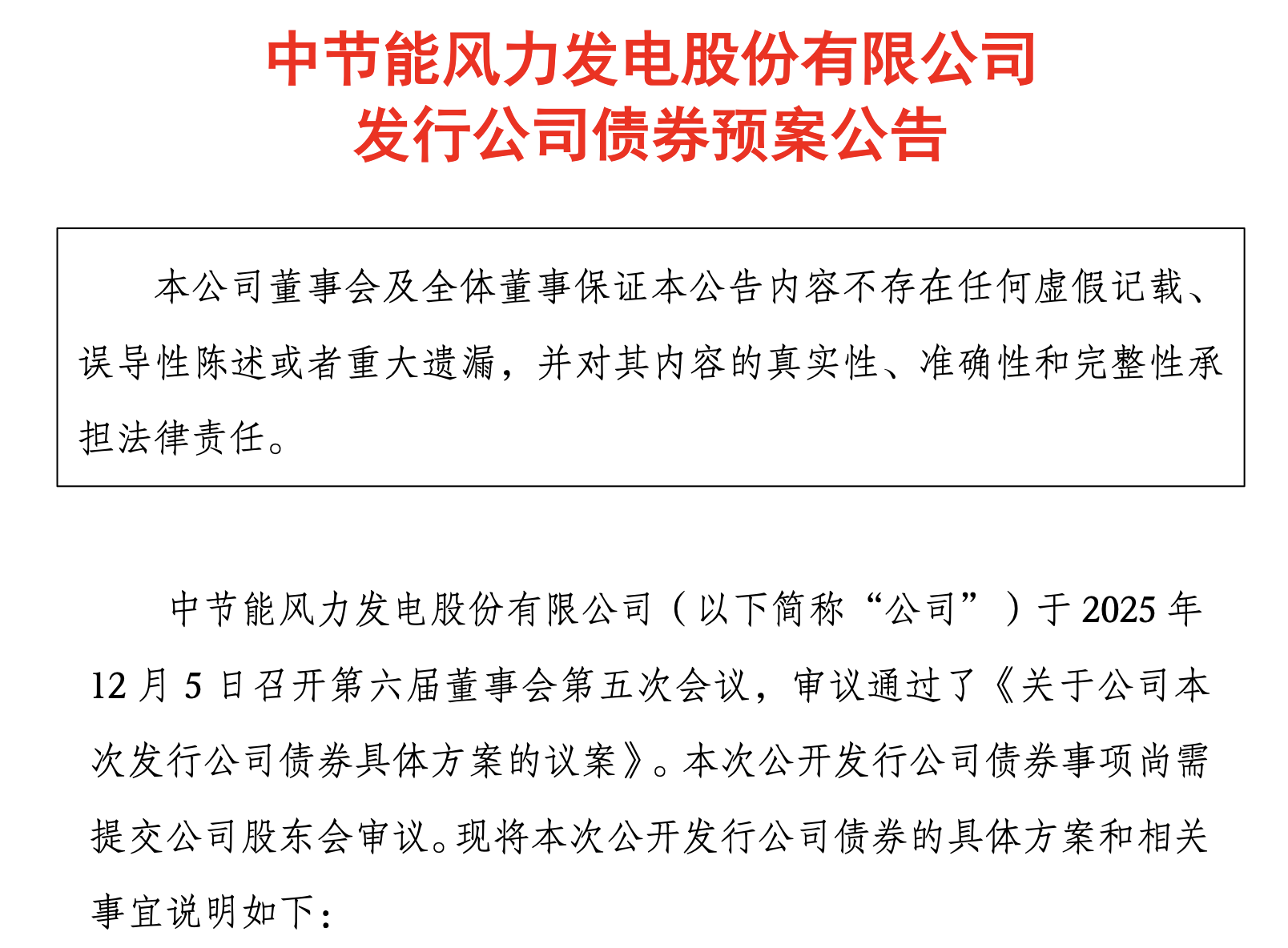 12月5日,节能风电(601016)公告,公司拟发行公司债券募资不超过20亿元,拟用于偿还到期债务、项目建设、运营或置换前期项目投入及补充公司流动资金等其他符合监管要求的用途。