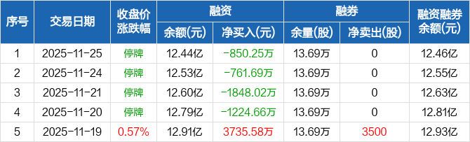 融资方面,当日融资买入0元,融资偿还850.25万元,融资净偿还850.25万元,连续4日净偿还累计4684.61万元。融券方面,融券卖出0股,融券偿还0股,融券余量13.69万股,融券余额243.55万元。融资融券余额合计12.46亿元。