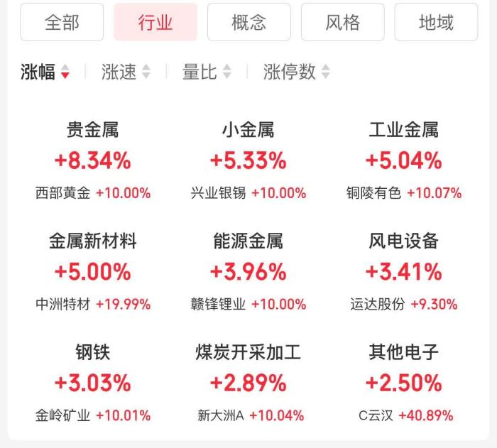 受此影响,贵金属板块爆发,西部黄金、四川黄金、山东黄金等多股涨停,相关个股纷纷上涨。小金属、工业金属、金属新材料等行业板块亦涨幅居前。