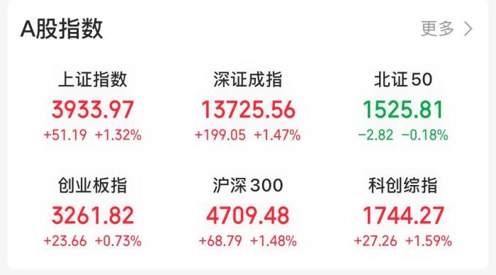 截至收盘,上证指数涨1.32%报3933.97点,续创10年新高;深证成指涨1.47%报13725.56点;创业板指涨0.73%报3261.82点。全市场成交额超2.6万亿元,较前一交易日大幅放量。