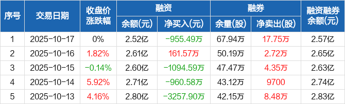 渝农商行:融资净偿还955.49万元,融资余额2.52亿元(10-17)