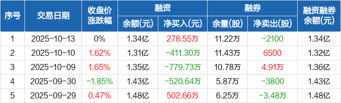 宏盛华源:融资净买入278.55万元,融资余额1.34亿元(10-13)