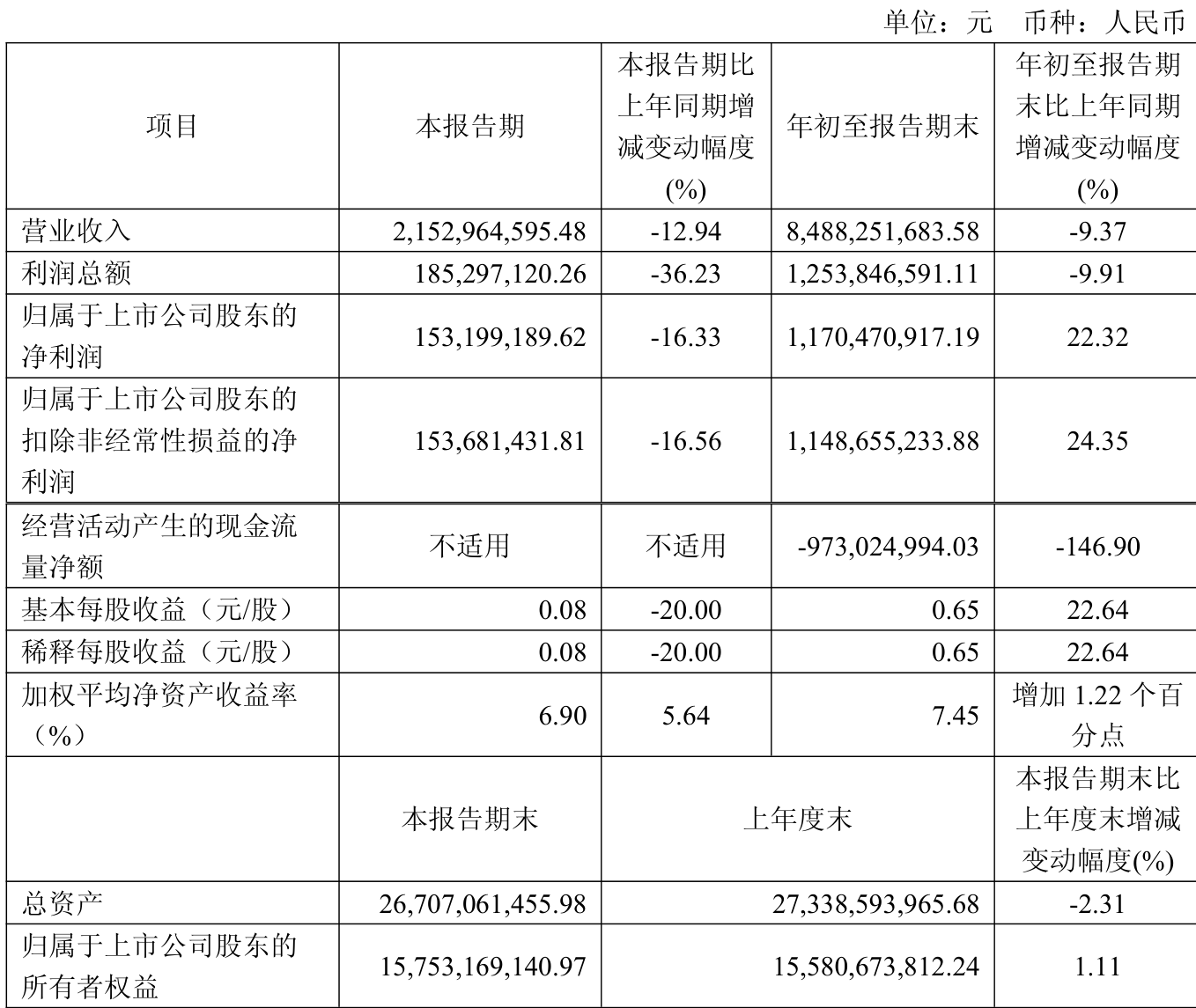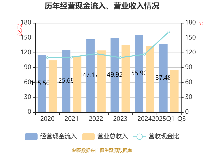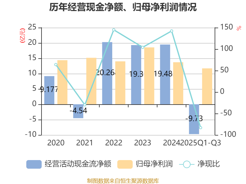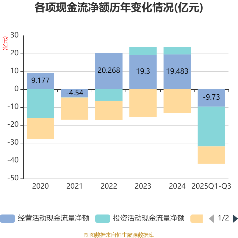 2025年前三季度,公司经营活动现金流净额为-9.73亿元,同比减少30.48亿元;筹资活动现金流净额-9.66亿元,同比增加1.76亿元;投资活动现金流净额-22.31亿元,上年同期为6.86亿元。