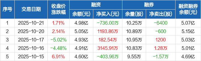 恒立液压:融资净偿还736万元,融资余额4.98亿元(10-21)