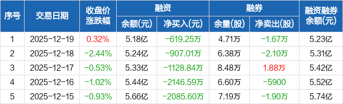 恒立液压融资融券信息显示,2025年12月19日融资净偿还619.25万元;融资余额5.18亿元,较前一日下降1.18%。