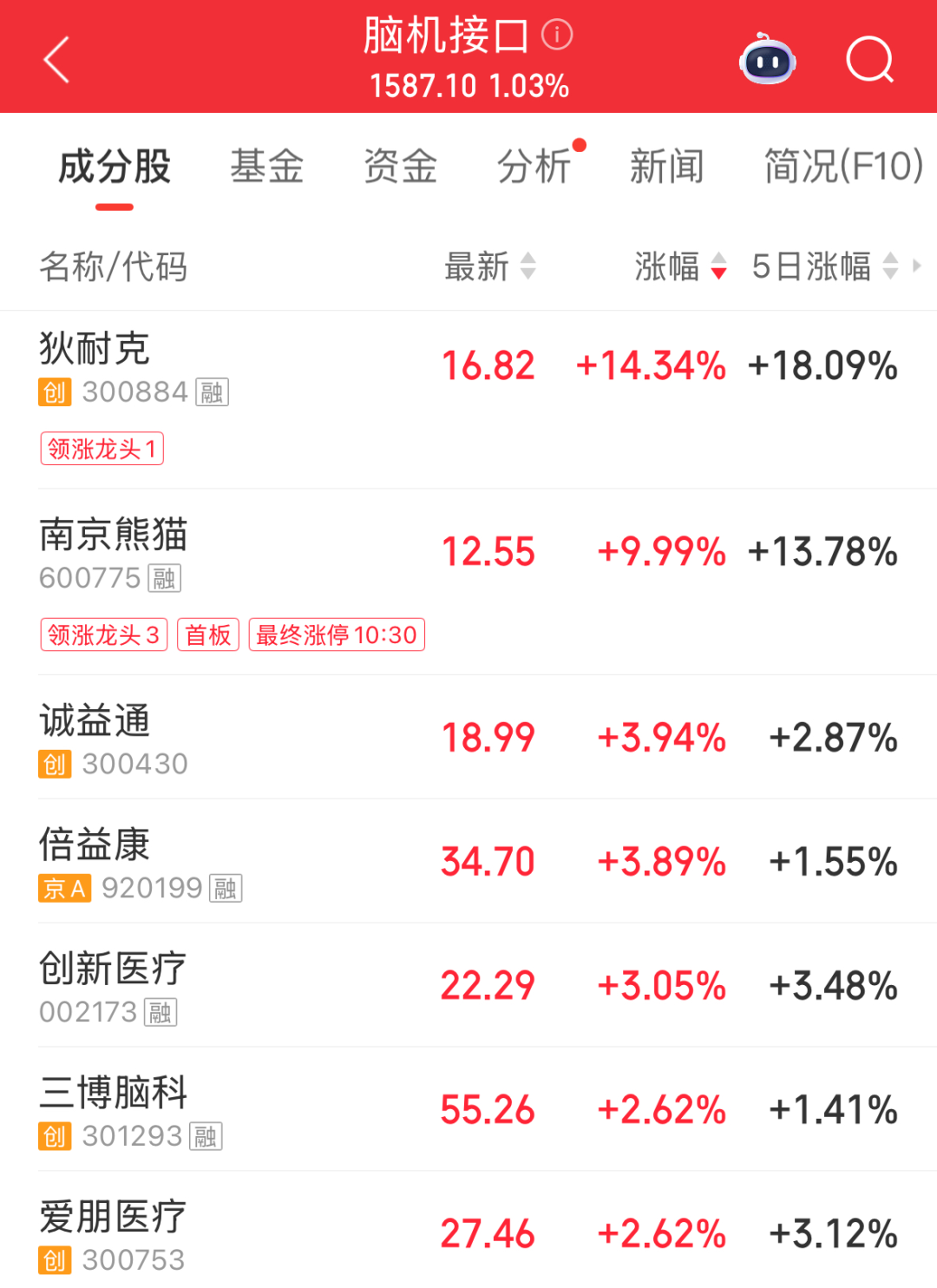 此外,脑机接口概念盘中异动拉升,南京熊猫直线涨停,狄耐克涨超14%,诚益通、倍益康、创新医疗等跟涨。消息面上,12月4日至5日,以“脑联世界智汇上海”为主题的2025脑机接口大会在上海举行。