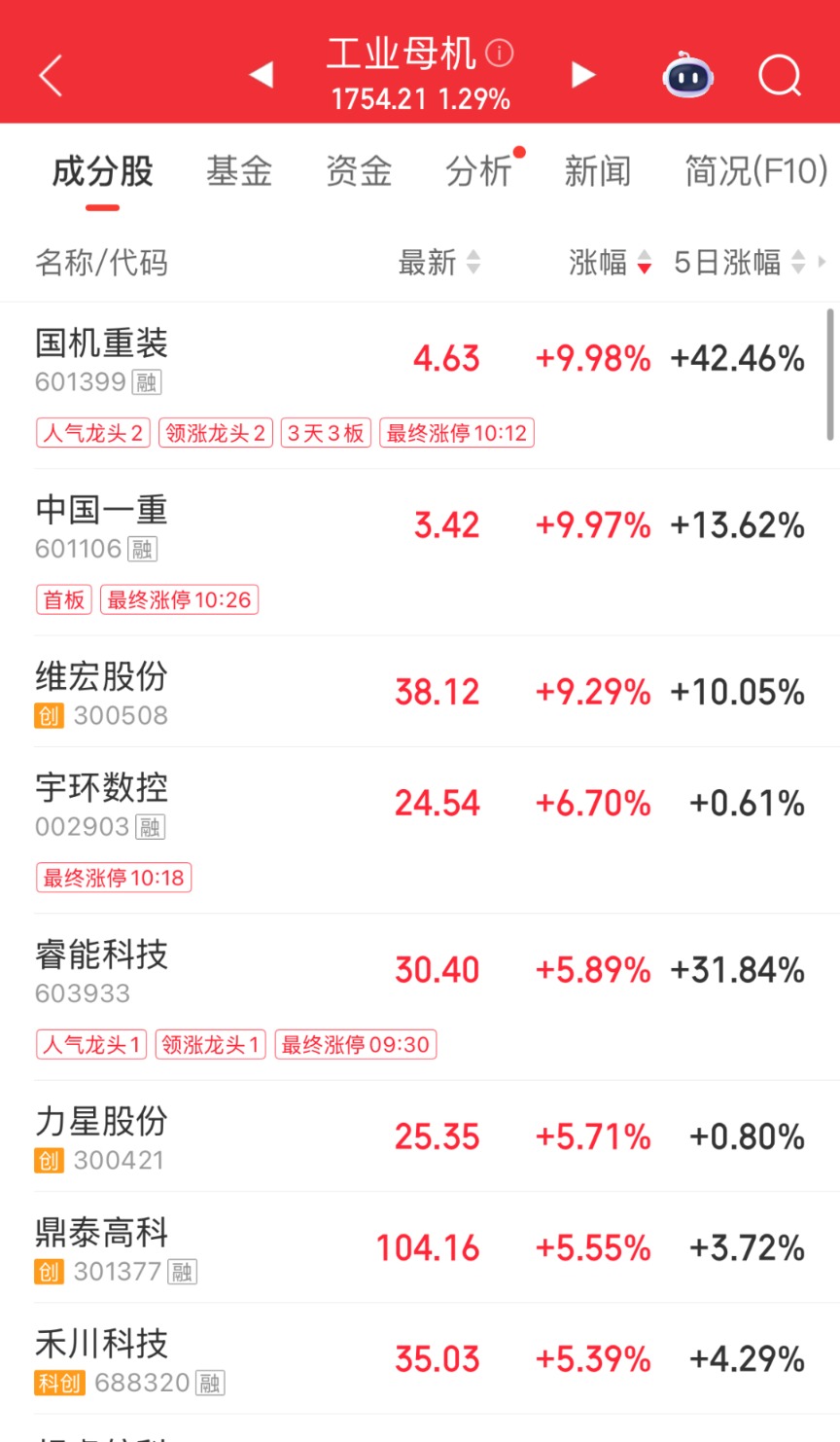 早盘,工业母机概念震荡反弹,中国一重直线涨停。国机重装此前封板,维宏股份、宇环数控、睿能科技、力星股份等跟涨。