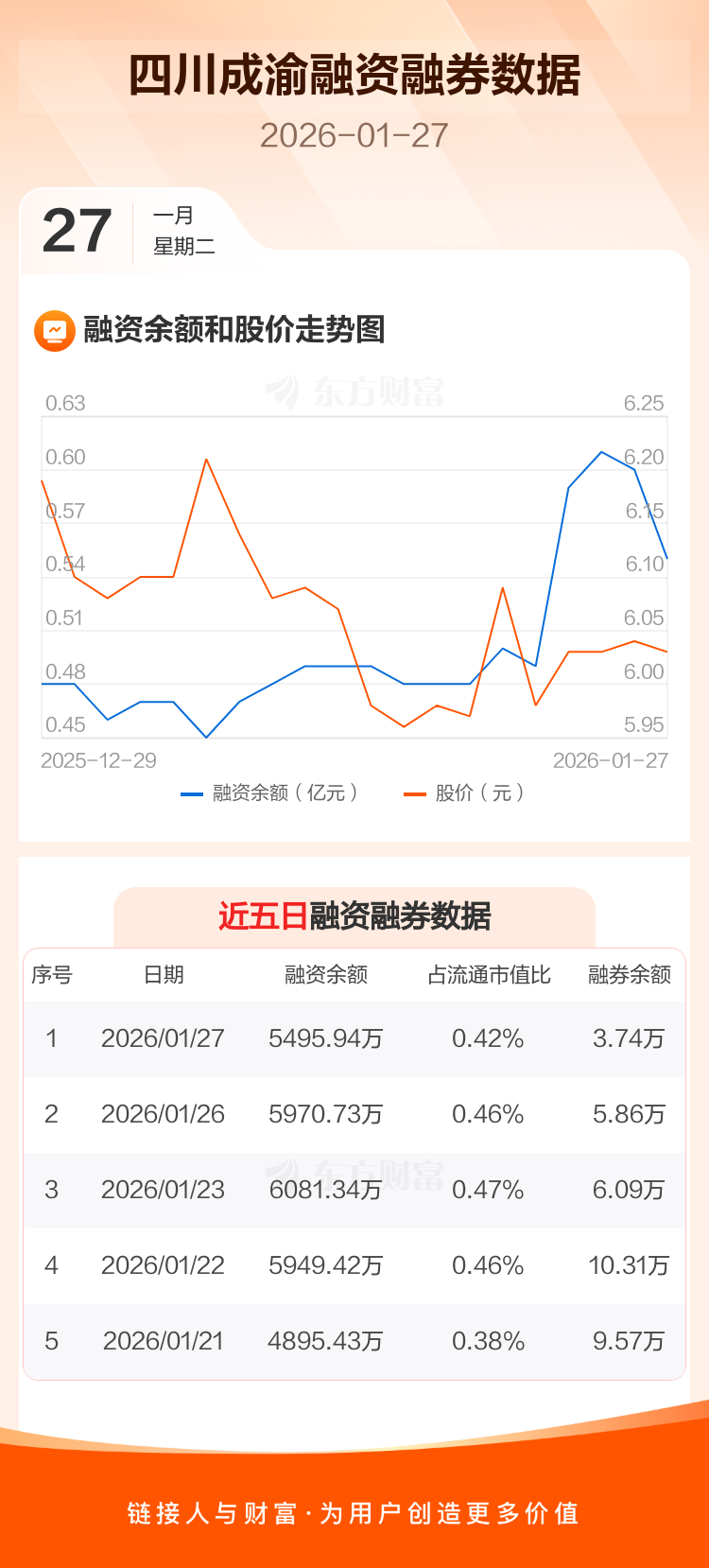 交易所最新数据显示,四川成渝于2026年1月27日获融资买入460.17万元,融资偿还934.96万元,当日融资净偿还474.79万元。目前,该股融资余额5495.94万,占流通市值比例为0.42%。