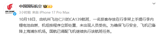 CA139航班空中起火,国航通报:行李内锂电池自燃