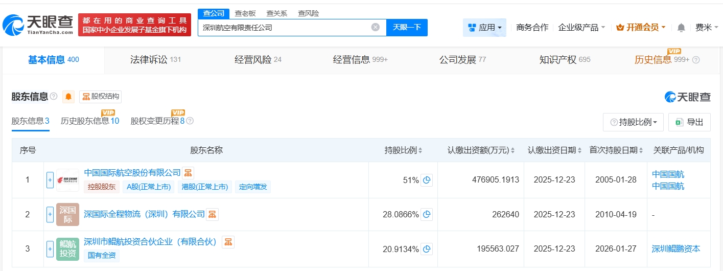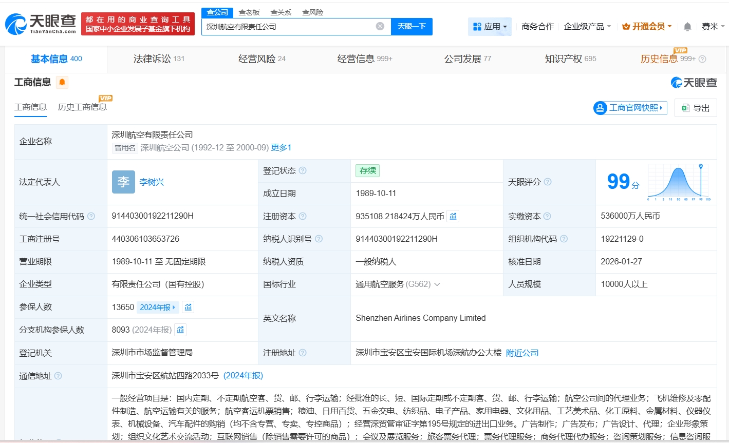 深圳航空公司增资至93.5亿元