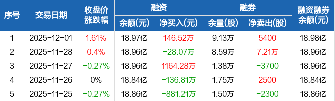 融资方面,当日融资买入7828.24万元,融资偿还7681.71万元,融资净买入146.52万元。融券方面,融券卖出7400股,融券偿还2000股,融券余量9.13万股,融券余额69.11万元。融资融券余额合计18.98亿元。