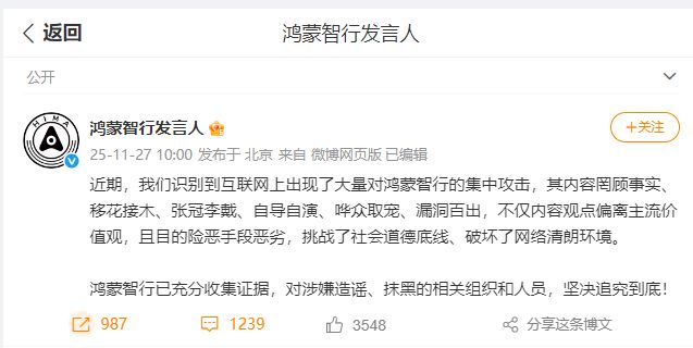 2025年11月27日,“鸿蒙智行发言人”官方微博发文称,近期公司识别到互联网上出现了大量对鸿蒙智行的集中攻击,其内容罔顾事实、移花接木、张冠李戴、自导自演、哗众取宠、漏洞百出,不仅内容观点偏离主流价值观,且目的险恶手段恶劣,挑战了社会道德底线、破坏了网络清朗环境。鸿蒙智行已充分收集证据,对涉嫌造谣、抹黑的相关组织和人员,坚决追究到底。