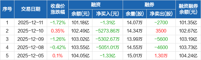 融资方面,当日融资买入2.74亿元,融资偿还4.05亿元,融资净偿还1.31亿元,连续7日净偿还累计4.53亿元。融券方面,融券卖出3000股,融券偿还5700股,融券余量14.07万股,融券余额1720.76万元。融资融券余额合计101.35亿元。