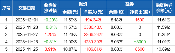 融资方面,当日融资买入8173.9万元,融资偿还7979.56万元,融资净买入194.34万元,连续6日净买入累计8886.71万元。融券方面,融券卖出2100股,融券偿还600股,融券余量8.18万股,融券余额170.55万元。融资融券余额合计11.61亿元。