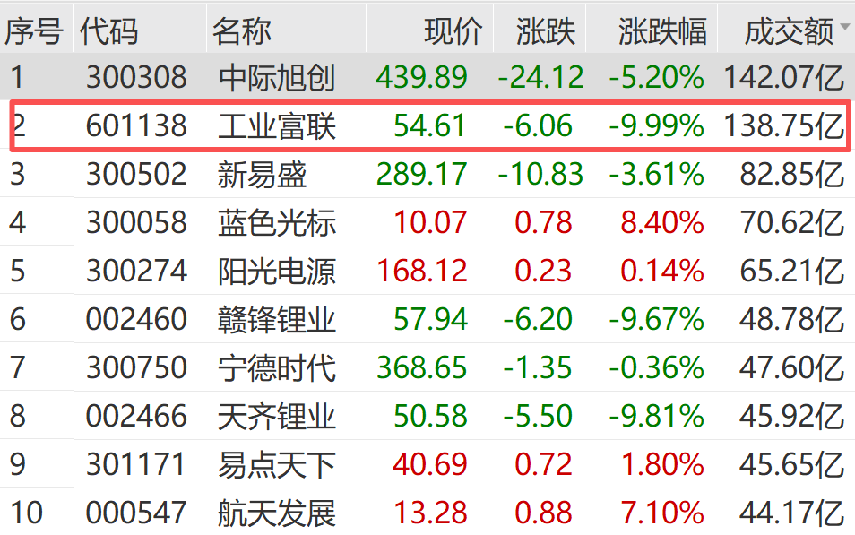 截至午间收盘,工业富联股价报54.61元/股,跌幅为9.99%,总市值为1.08万亿元;半日成交额达138.75亿元,居A股第二位。