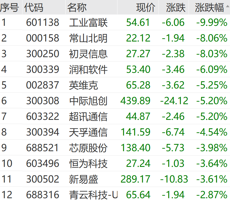 AI算力方向整体不振,常山北明、英维克、中际旭创、天孚通信、新易盛等普遍走低。