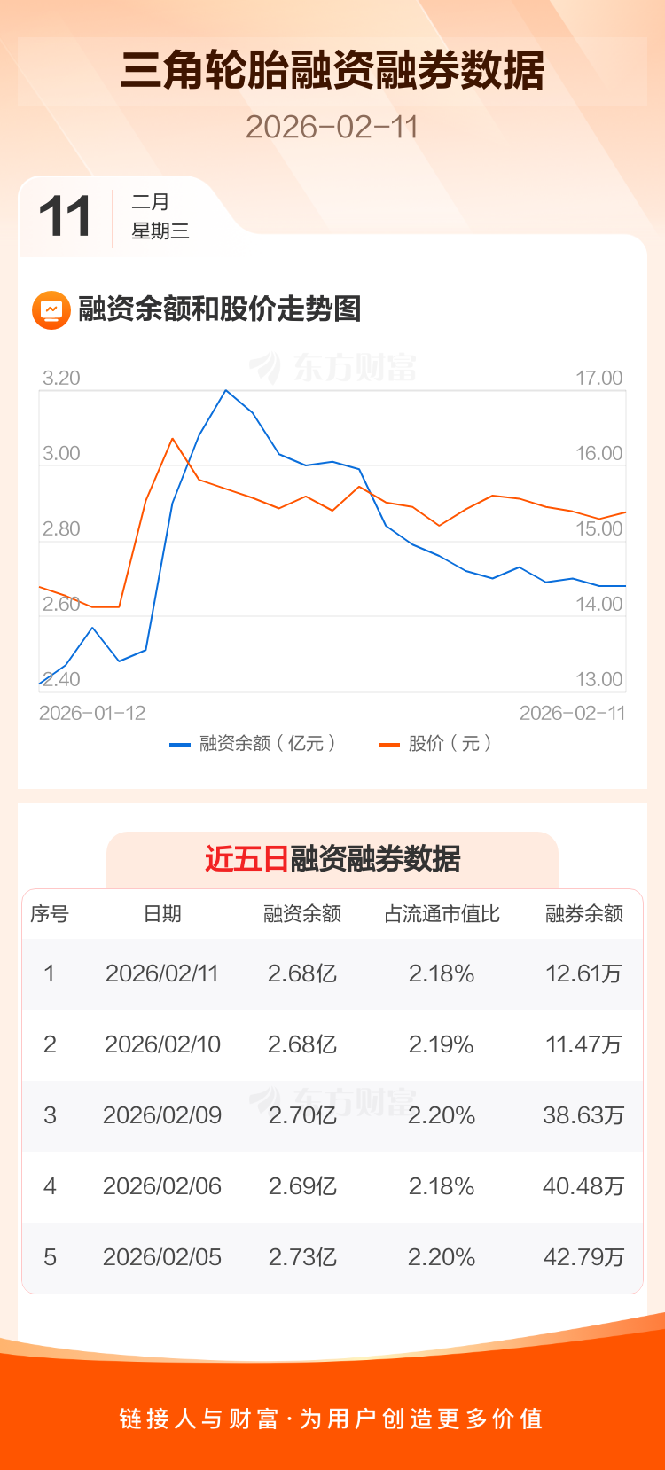 交易所最新数据显示,三角轮胎于2026年2月11日获融资买入440.71万元,融资偿还481.88万元,当日融资净偿还41.17万元。目前,该股融资余额2.68亿,占流通市值比例为2.18%。