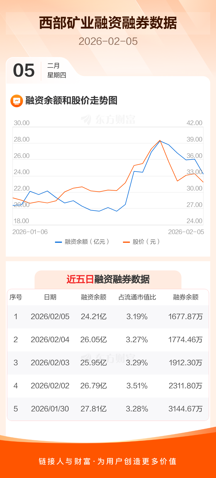 交易所最新数据显示,西部矿业于2026年2月5日获融资买入2.05亿元,融资偿还3.89亿元,当日融资净偿还1.85亿元。目前,该股融资余额24.21亿,占流通市值比例为3.19%。