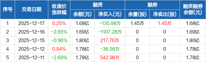 杭齿前进:融资净偿还135.98万元,融资余额1.68亿元(12-17)