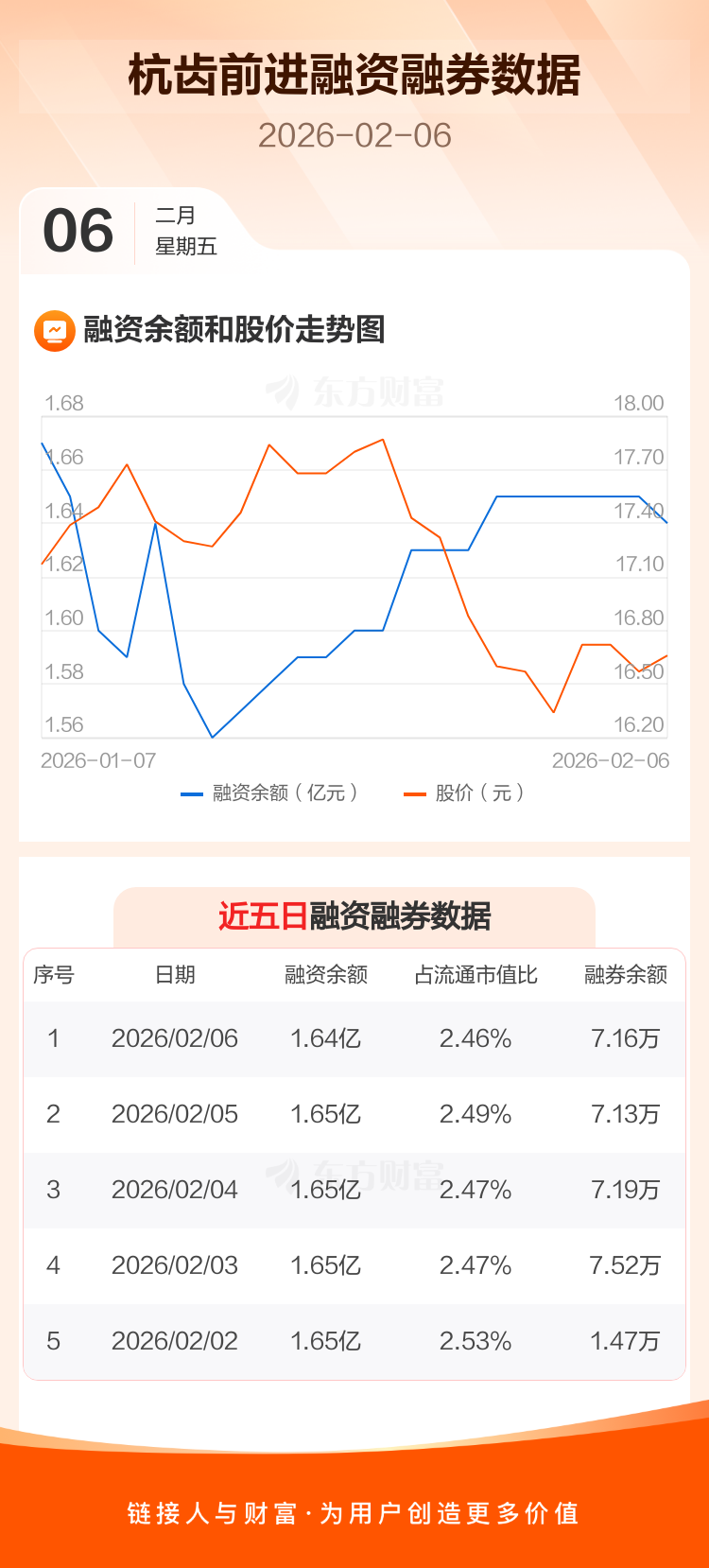 交易所最新数据显示,杭齿前进于2026年2月6日获融资买入592.23万元,融资偿还730.78万元,当日融资净偿还138.55万元。目前,该股融资余额1.64亿,占流通市值比例为2.46%。