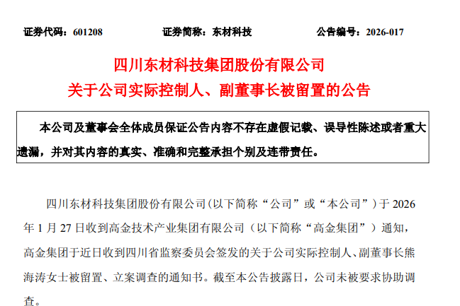 1月27日晚,东材科技发布公告称,公司于1月27日收到控股股东高金技术产业集团有限公司通知,高金集团于近日收到四川省监察委员会签发的关于公司实际控制人、副董事长熊海涛被留置、立案调查的通知书。截至公告披露日,公司未被要求协助调查。