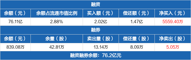 融资方面,当日融资买入2.02亿元,融资偿还1.47亿元,融资净买入5559.4万元。融券方面,融券卖出13.14万股,融券偿还8.09万股,融券余量42.81万股,融券余额839.08万元。融资融券余额合计76.2亿元。