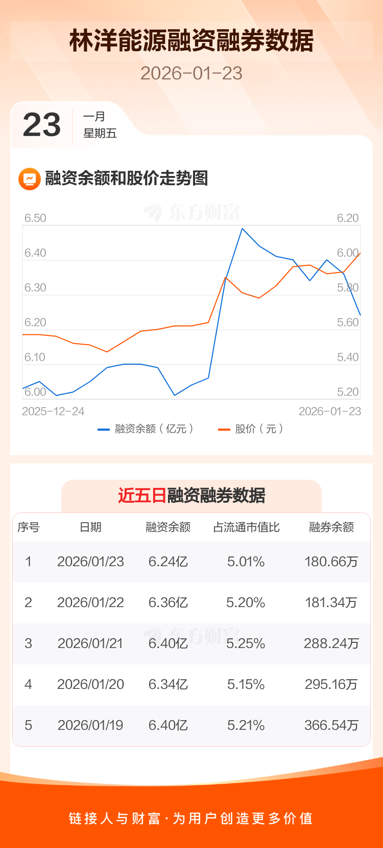 交易所最新数据显示,林洋能源于2026年1月23日获融资买入1710.49万元,融资偿还2883.61万元,当日融资净偿还1173.12万元。目前,该股融资余额6.24亿,占流通市值比例为5.01%。