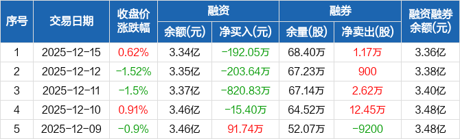 广州港融资融券信息显示,2025年12月15日融资净偿还192.05万元;融资余额3.34亿元,较前一日下降0.57%。