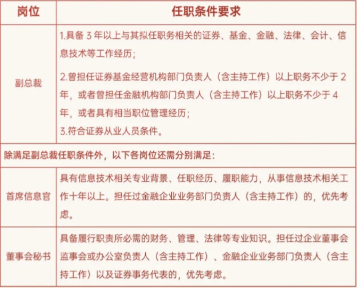 分岗位看,副总裁人选需具备3年以上与其拟任职务相关的证券、基金、金融、法律、会计、信息技术等工作经历;曾担任证券基金经营机构部门负责人(含主持工作)以上职务不少于2年,或者曾担任金融机构部门负责人(含主持工作)以上职务不少于4年,或者具有相当职位管理经历;符合证券从业人员条件。