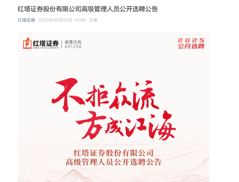 9月22日,红塔证券发布公告称,根据发展需要,现面向公司内外部开展公开选聘,计划选聘高级管理人员4名,涉及副总裁、首席信息官、董事会秘书三个职位。