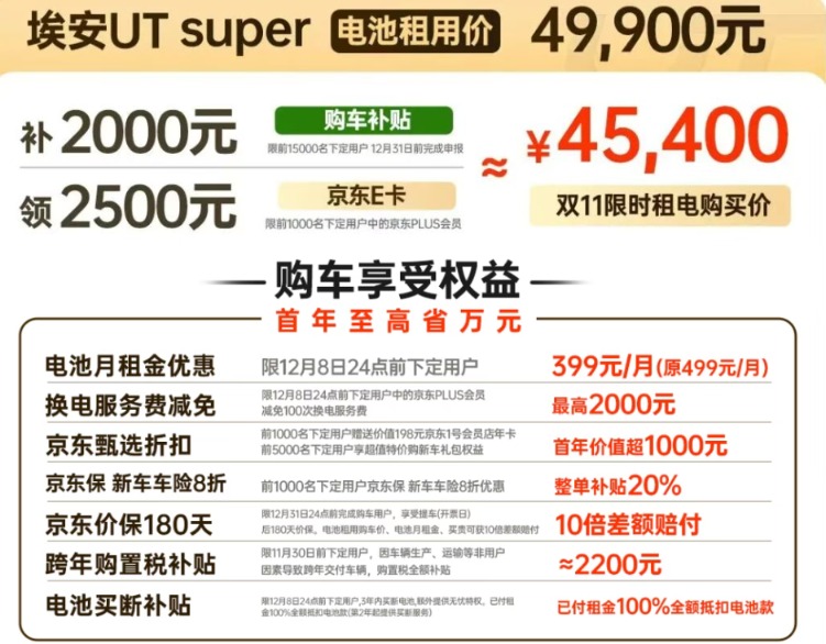 埃安UT super引发市场关注,主要由于其提供电池租用和整车购买两种方式,其中采用电池租用方式的购买价为4.99万元,并且在12月8日24点前下单,电池月租金由499元/月降至终身399元/月。