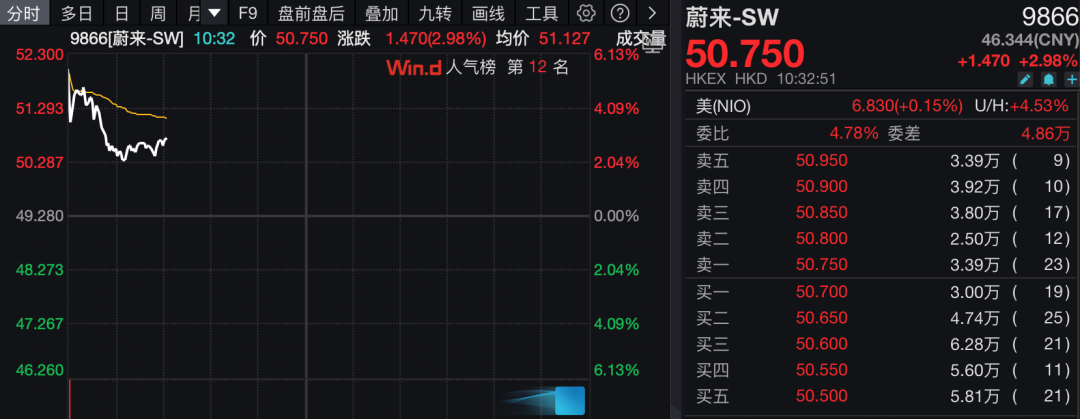 蔚来港股一度反弹超5%,截至发稿涨2.98%,上日收跌近9%。